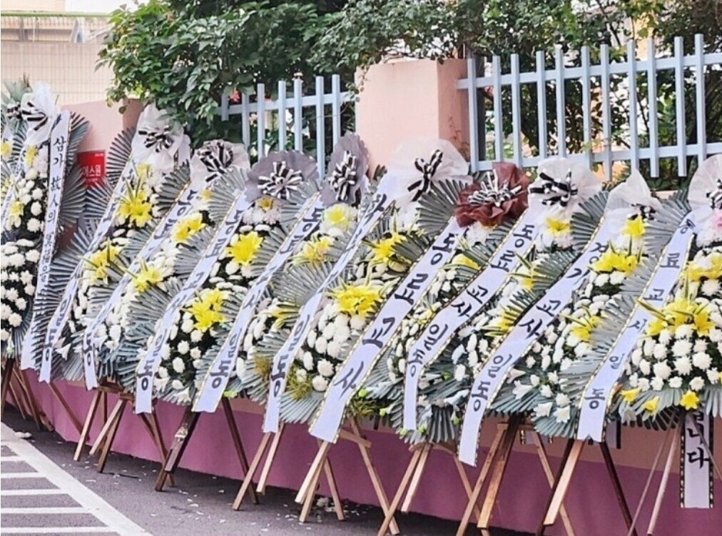 전국의 교사들이 서이초등학교 정문 앞으로 근조화환을 보냈고, 20일 새벽 수 많은 화환들이 설치됐습니다.